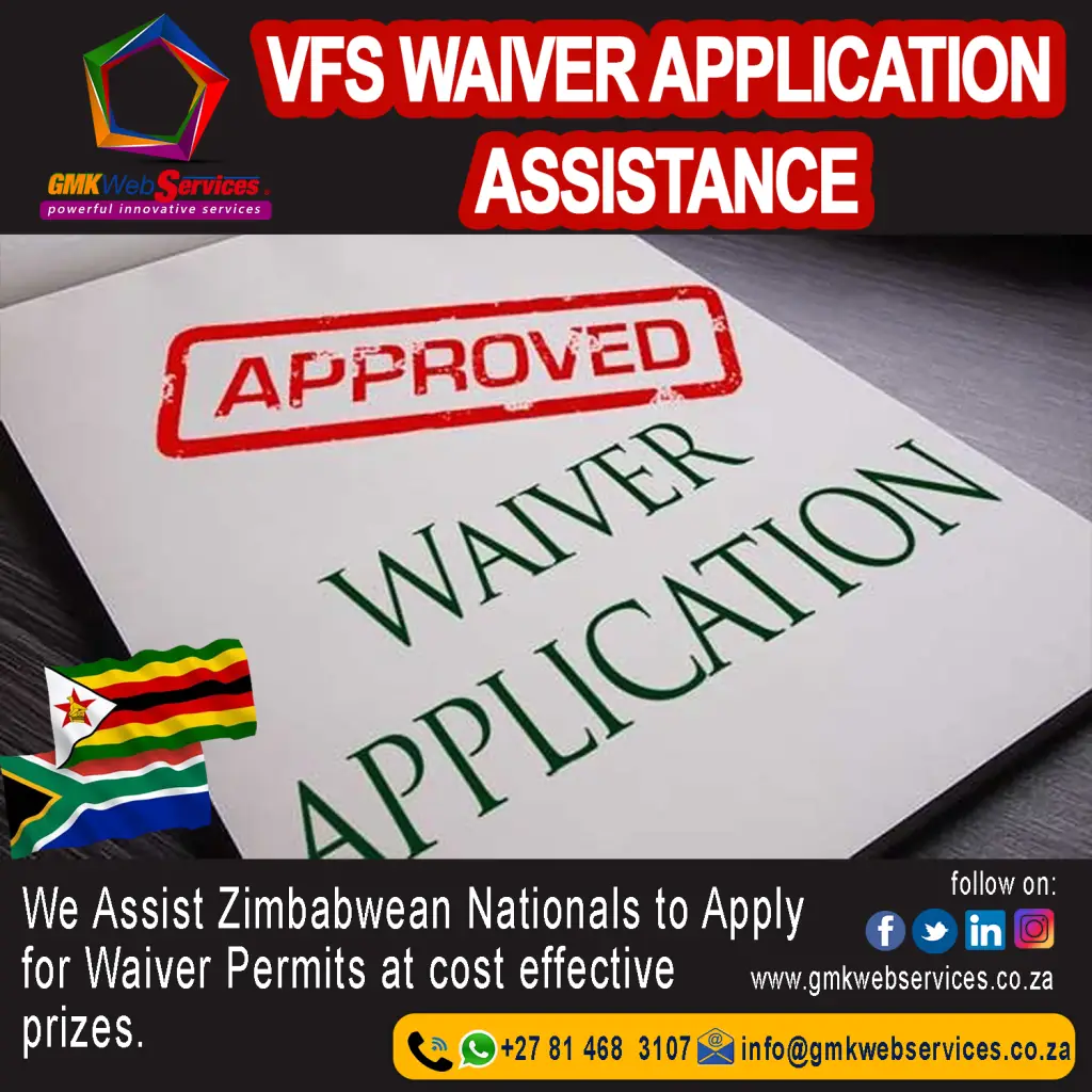 Waiver Application Assistance. We assist Zimbabwean Nationals to Apply for VFS Waiver Applications at cost effective prices. Contact GMK Web Services for Pricing.